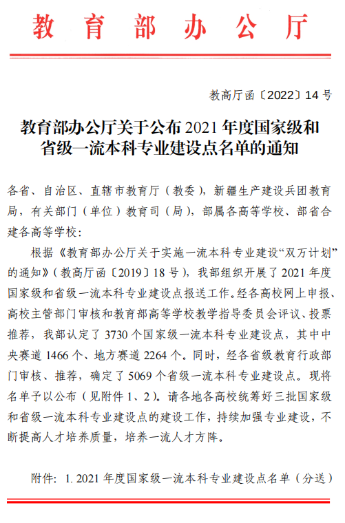近日,教育部印发了《教育部办公厅关于公布2021年度国家级和省级一流本科专业建设点名单的通知》文件,公布了2021年度国家级和省级一流本科专业建设点名单。我校播音与主持艺术专业获批省级一流本科专业建设点。截止到目前,我校共有国家级一流本科专业建设点1个,省级一流本科专业建设点4个。
