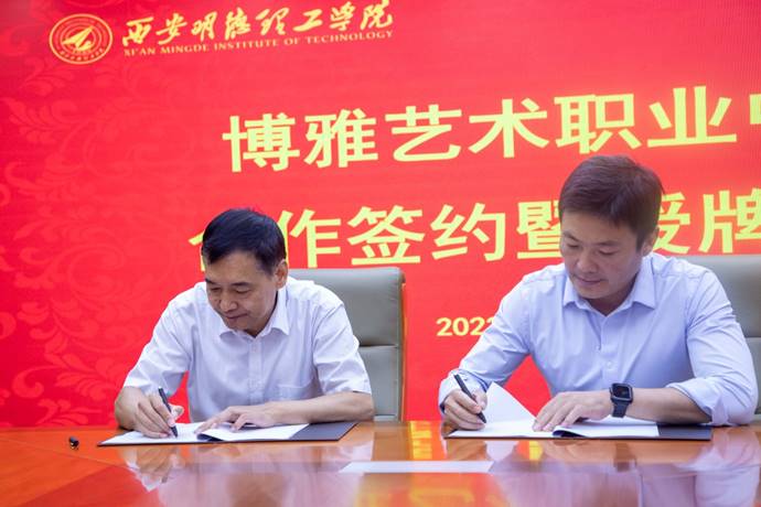 仪式最后,校长杨健君代表我校与博雅艺术职业中学签署“合作协议书”,为同时为博雅艺术职业中学授予了“优质生源基地”、“明德博雅艺术类教育教学基地”、“就业实习基地”牌匾。