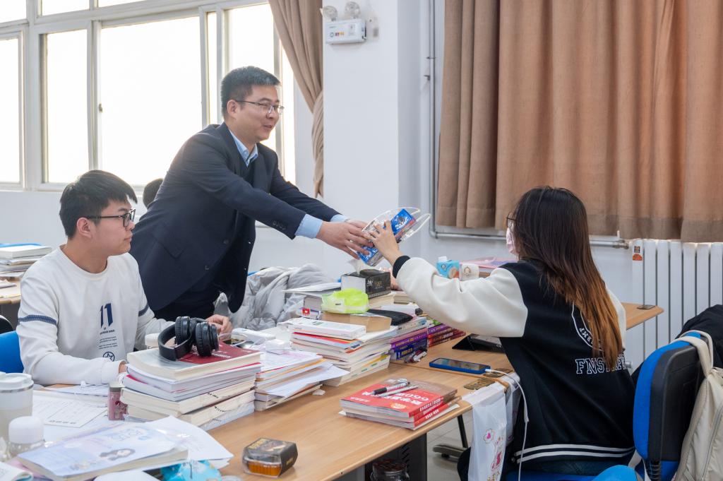 2024年全国硕士研究生初试在即,为鼓励考生积极迎考,增强备考信心,12月19日上午,校长王志刚,副校长朱延波,副校长刘星,学校办公室、党委组织宣传部、党委学生工作部负责人以及终南书院院长、副院长一行为紧张备考的学子发放考研能量包,为考研学子送去冬日的温暖和祝福。