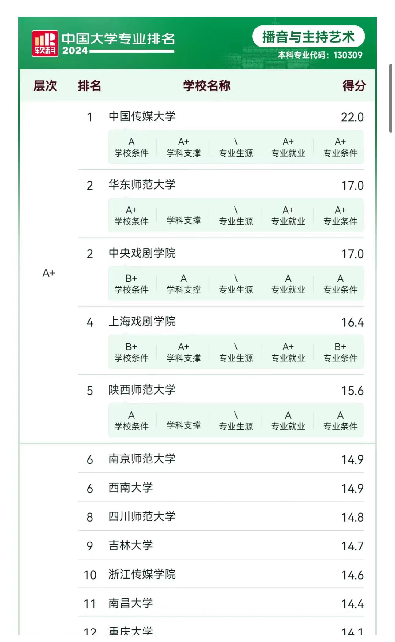 6月13日,上海软科正式发布2024“软科中国大学专业排名”,我校艺术与设计学院播音与主持艺术专业排名再次上升,以综合10.2分位居全国第44名,迈入全国50强、全国民办第三,陕西第二。该项排名连续两年获B+等级,实现了我校软科B+级排名上的突破,同时有望向A级排名冲刺。2023年该专业就“冲出”西安民办高校包围圈。今年排名又有所上升,晋升全国民办三强,陕西第二。