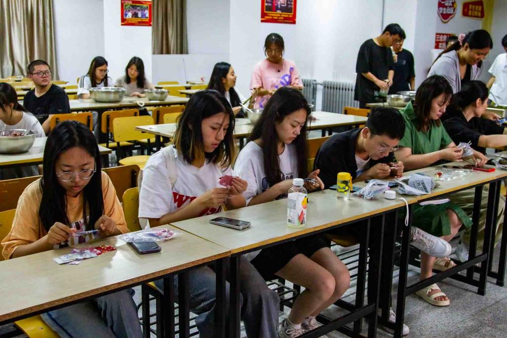 活动中,大家围在一起包粽子,做香囊,现场热情高涨,专注投入。折叠粽叶,舀放、盖严食材,再用线绳系紧......一片片粽叶、一根根线绳在大家手中灵活地跳动着;制作香囊的师生们穿针、引线、打结、裁剪,再到挂珠串儿、装香料、缝合,丝丝线线缠绕出对端午节祥和、生活安康的美好祝愿,整个活动过程充满了欢声笑语。