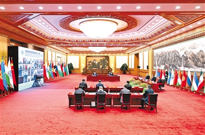 7月4日下午,国家主席习近平在北京以视频方式出席上海合作组织成员国元首理事会第二十三次会议并发表题为《牢记初心使命 坚持团结协作 实现更大发展》的重要讲话。 新华社记者 李学仁摄 |