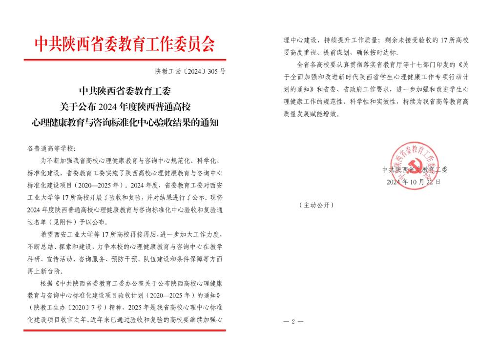 近日,中共陕西省委教育工委公布了《中共陕西省委教育工委关于公布2024年度陕西普通高校心理健康教育与咨询标准化中心验收结果的通知》,学校顺利通过此次验收,大学生心理健康教育中心获评“陕西普通高校心理健康...
