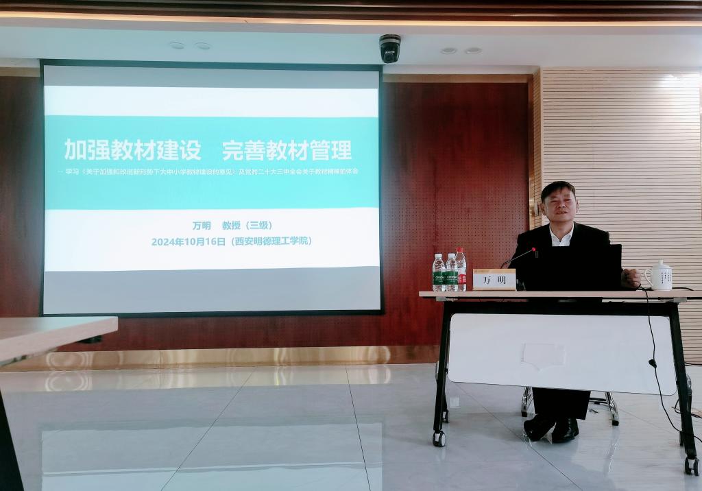 为全面贯彻习近平总书记关于教育和教材建设的重要论述,进一步推动学校教材建设与应用,帮助老师们更好地了解教材建设的形势和政策,提高新形态教材的资源建设、编写和出版能力,推进学校教材建设工作高质量发展,助力培育新一轮国家级、省级规划教材和优秀教材。10月16日下午,学校邀请万明教授为我校教师带来题为“加强教材建设完善教材管理”的培训。各学院教学副院长、中级及以上职称专职教师代表,各学院教材管理人员参加了培训,讲座由教务处副处长任华主持。