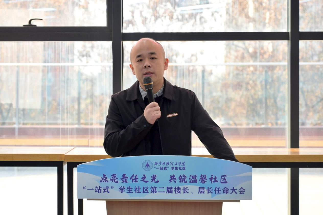 最后,党委学生工作部副部长童杨梓讲话。童杨梓老师充分肯定了楼层长在宿舍管理工作中的重要作用和贡献,接着他对全体楼层长提出了三点要求:一是要发挥模范带头作用,在学业、品德、行为规范等各方面以身作则,为同学们树立榜样;二是要强化服务意识,主动了解同学们的困难诉求,及时反馈、协助解决,让社区充满温暖关怀;三是要创新工作方法,积极组织各类文化、学习活动,增强社区凝聚力与活力,打造各具特色的楼层文化。