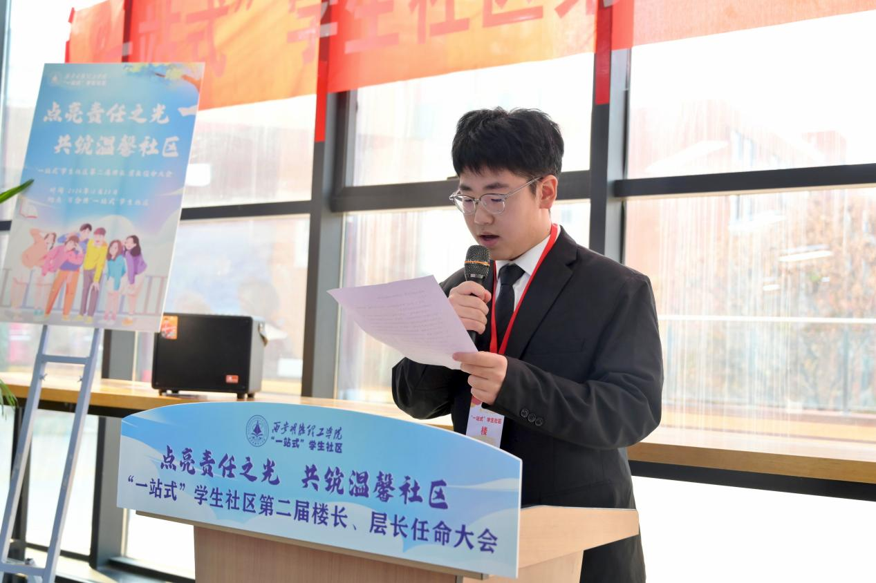 大会伊始,艺术与设计学院党委副书记乔建宣读了《关于“一站式”学生社区楼长、层长任命的决定》文件,本届共有19名同学获聘楼长,103名同学获聘层长。
