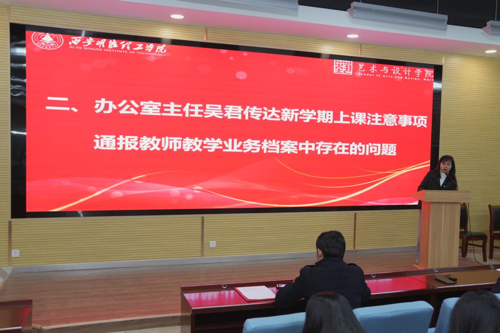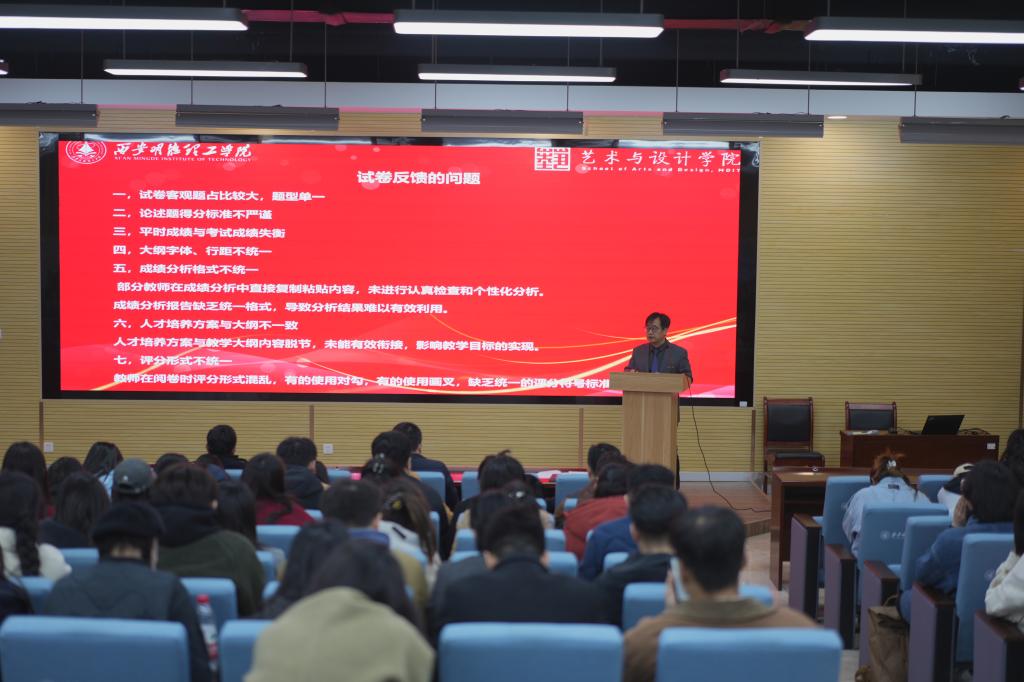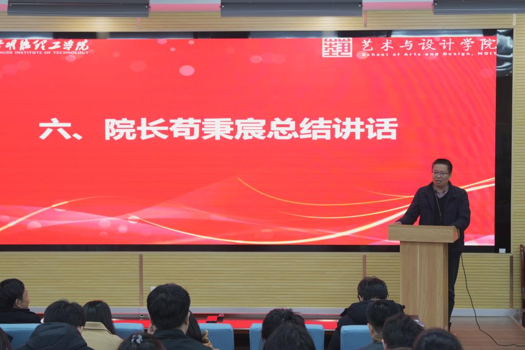 最后,院长苟秉宸总结讲话,2025年是学校迎评促建的关键年,也是学院“十四五”规划的收尾年,聚焦教学评建,不断凝练文化育人与实践育人特色、深化“教在明德”与“学在明德”品牌建设、推动各项工作内涵式发展将是学院2025年工作的重中之重。他强调:全院教职工应该紧密围绕教学评建中心工作,精准发力,做好五个提升,一是提升“学在明德”质量,密切关注2025届考研上线率,针对上岸学生安排教师进行点对点指导,从而提升考研录取率;二是提升品牌效应,加强媒体宣传与招生宣传,不断提升学生录取数量与质量,同时提升报到率;三是提升专业内涵质量,注重现有专业的内涵式发展,同时做好新专业的申报工作,不断优化学科及专业结构;四是提升文化育人氛围,打造具有艺术与设计类专业特色的文化氛围,提升学院显示度,为明德文化育人打好基础;五是提升“教在明德”质量,号召全院教师全力以赴,在教改科研、产教融合等工作中取得突破性及标志性成果,为学院高质量发展增添亮点。