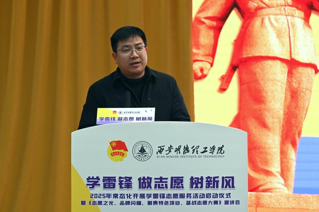 校团委副书记刘雄在致辞中指出,学校近年来通过学校“334”实践育人体系和共青团“6333”工作格局培育出中国青年志愿服务项目大赛金奖等标志性成果,实现了“思政引领”与“实践赋能”的深度融合。他强调,雷锋精神是新时代青年的精神坐标,号召全体学生以“传承者、实干者、创新者”三重身份投身志愿服务:一要厚植家国情怀,在乡村振兴、生态治理等国家战略中践行使命;二要深耕专业优势,打造“智慧助老”“非遗传承”等特色项目;三要瞄准国家级赛事,以“品牌化、专业化、长效化”提升志愿服务内涵。
