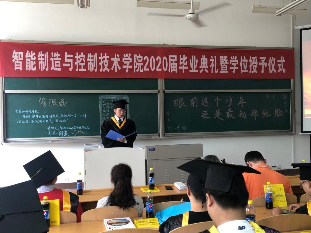 7月12日上午九时,智能制造与控制技术学院在4#教学楼101教室,隆重举行学院2020届毕业典礼暨学位授予仪式。因疫情防控要求,明德学院2020届毕业生毕业典礼暨学位授予仪式在学院明志楼中厅隆重举行,本次典礼采用主副会场加线上直播的方式举行,各二级学院分会场通过新媒体平台对毕业典礼进行了“云”直播。学院副院长朱延波,办公室主任张啭啭,党总支书记陈雪彬,各专业负责人及教师代表,学院2020届毕业生150余人出席了此次分会场的典礼,典礼由毕业班辅导员刘雄主持。