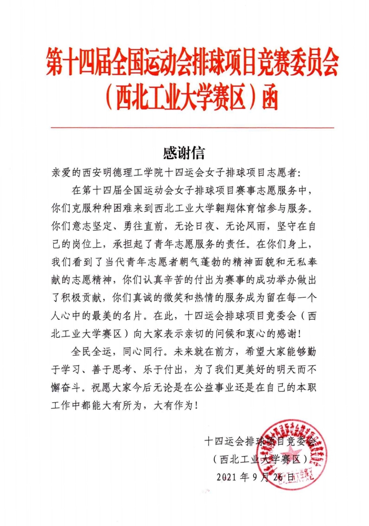 在本次十四运会女子排球成人组比赛中,明德“小秦宝”们积极践“奉献、友爱、互助、进步”的志愿精神,恪尽职守,任劳任怨,以热情细致的服务为全运增添了光彩,为明德赢得了赞誉。