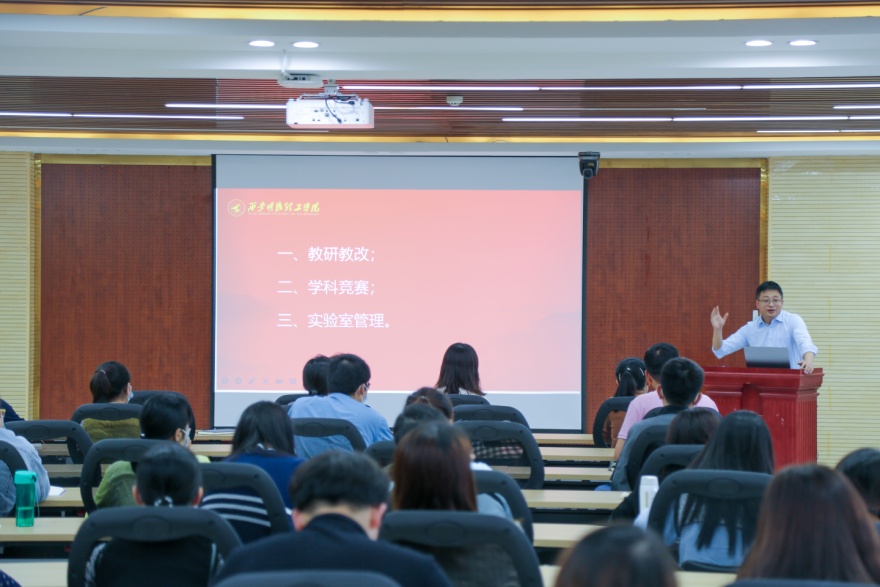 副院长黄烨从教研教改、学科竞赛、实验室管理等方面对大家提出了要求,要求大家“找准方向、突出特色、广泛申报”,并注重学生动手能力的培养。