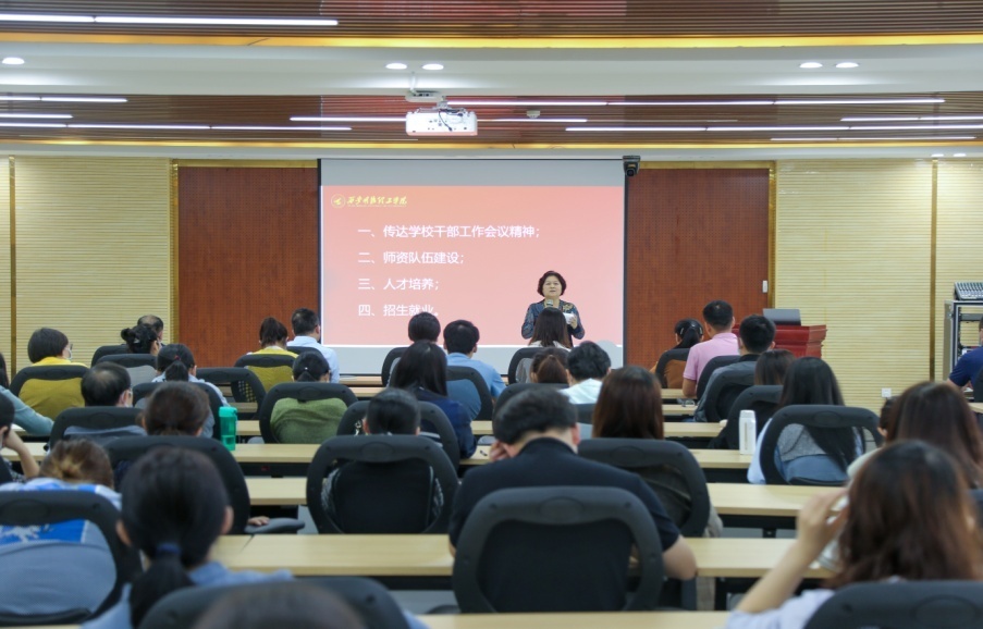院长王丽芳在会上作了讲话。她首先传达了本学期学校干部工作会议精神,学习了杨健君校长《贯彻办学理念,落实办学定位,建设高质量应用型人才培养体系》的报告,要求全体教职工坚持“以学生为根,以育人为本,以教师为要,以责任为重”。王院长指出,教师应具备三种能力:第一,教书育人的能力。作为教师,应忠诚党的教育事业,更新教育观念,时时以一名优秀教师的标准要求自己;第二,教改教研的能力。教师应不断更新自己的知识和观念,不断提高自身素质,研究学生规律,将新的教学模式引入课堂,因材施教,常变常新;第三,科学研究的能力。教师应重视自身科研综合素养的培养与能力提升,通过多种有效途径,积极开展科学研究,在研究中不断发现问题、解决问题,发挥自己的优势,让课堂更加生动。王院长强调,教师要注重提高人才培养质量,要用心上课,用心做“好老师”。