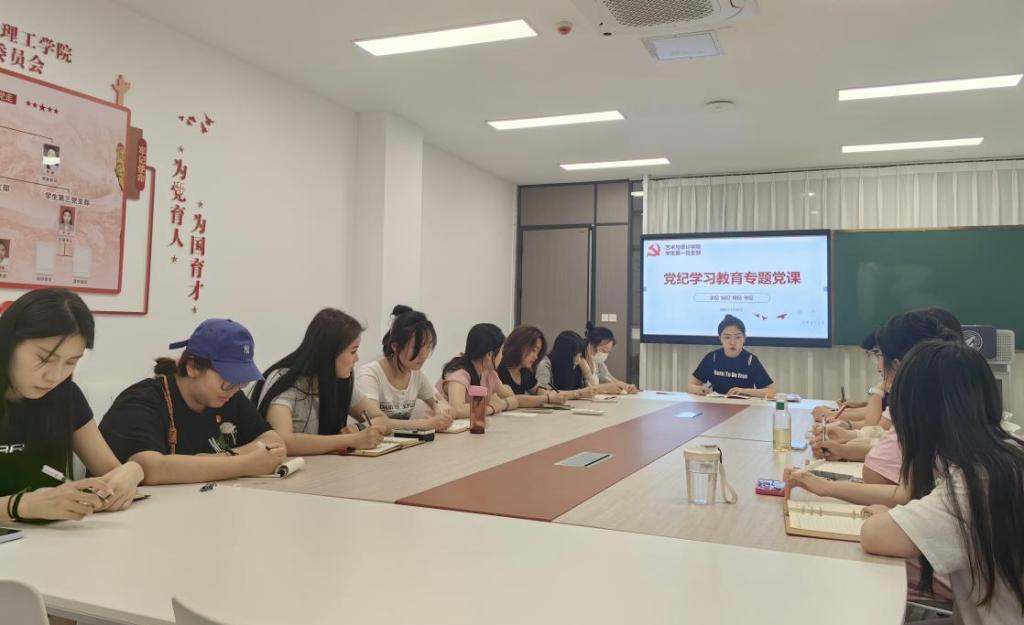 为提升支部党员党纪学习能力,推动党纪学习教育走深走实。5月27日晚,艺术与设计学院学生第一党支部书记张睿华同志在汉源楼302党建活动室开展以“学纪 知纪 明纪 守纪”为主题的党纪学习教育专题党课,学生第一党支部全体党员参加此次党课。