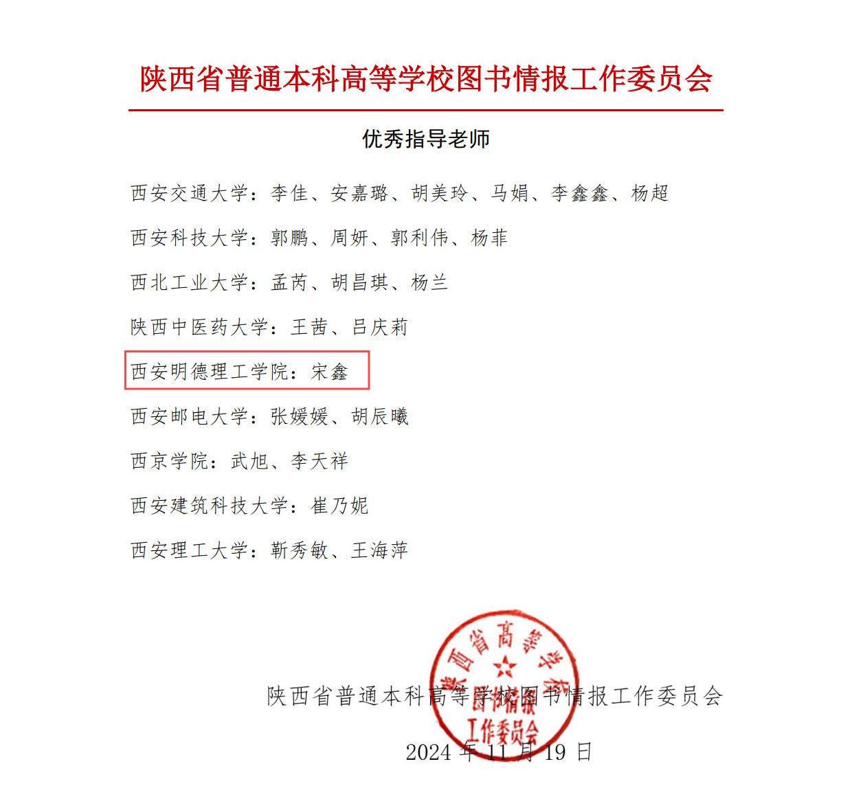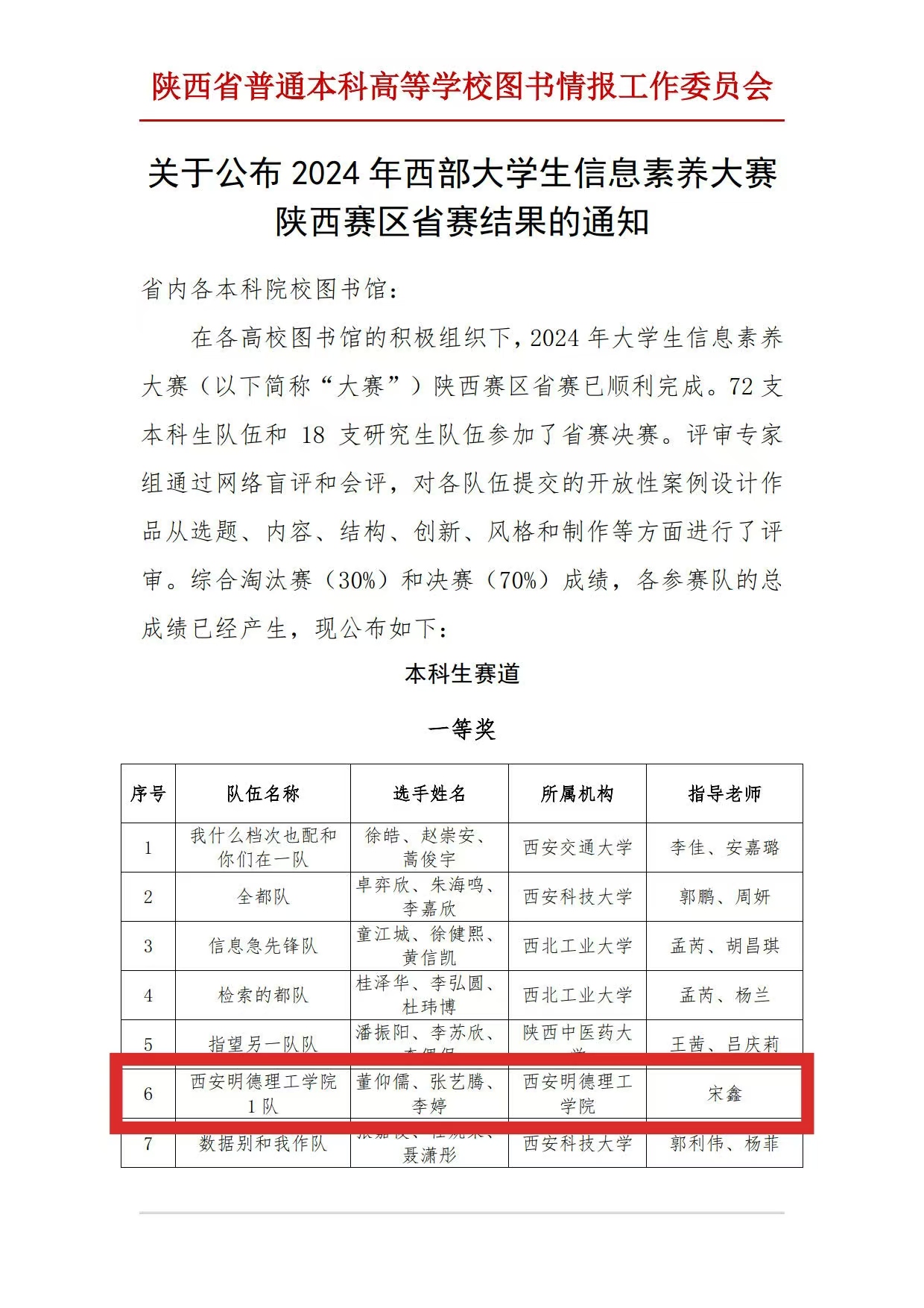 热烈祝贺我校董仰儒、张艺腾、李婷三位同学荣获2024年大学生信息素养大赛陕西省赛区一等奖,宋鑫荣获优秀指导教师。