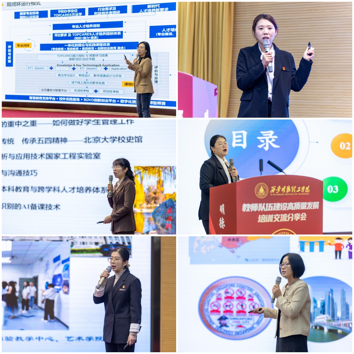 在教师交流分享环节,来自各学院的14位教师作为部分培训班的优秀代表,依次上台进行了精彩的汇报,分享了他们外出培训的珍贵收获、深刻感悟及培训成果转化情况。内容从国内外顶尖学府先进教育理念到应用型人才培养体系的构建,从知名院校的实践操作到课程思政的深耕细作,从教学组织与方法的创新到信息化教学管理平台的应用,从智能制造领域的前沿探索到艺术人才培养模式的创新实践,从辅导员思想政治教育工作的提升到“双师双能型”教师技能的锤炼,全方位、多角度地展现了教师们在培训中的所学、所思、所悟,犹如一场知识的盛宴,为在场听众带来了深刻的启发和思考,台下的教师们沉浸其中,深感收获颇丰。