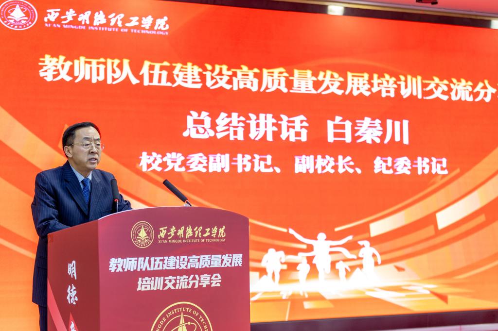 学校党委副书记、副校长、纪委书记白秦川作总结讲话。他首先对14位教师的精心准备和精彩分享表示衷心感谢!他认为本次分享会对推动学校教师队伍建设高质量发展具有重要意义。他指出,高质量发展已经成为时代的主题,建设高质量教师队伍是学校发展的关键所在。学校今年培训工作从基础培训向高质量培训不断创新转化,本次高质量培训分享汇报,即是相互学习、相互探索的良好平台,也是汇聚共识、凝聚力量的新形式,是学校教师队伍高质量建设的冲锋号。他希望全体教师要以此次分享会为契机,认真思考、积极谋划,高标准、严要求,勤奋学习,快速提升,努力适应新形势、新要求,早日成为思想坚定、专业过硬、技能娴熟、成果突出的新时代优秀教师,成为家长放心,学校放心,社会放心,具有教育家情怀,具有“大先生”风骨的教学名师,为培养半岛平台高素质应用型人才贡献自己的力量。