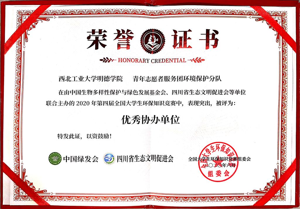 为树立和践行习近平总书记在党的十九大报告中指出的绿水青山就是金山银山的理念,坚持节约资源和保护环境的基本国策,进一步营造绿色和谐的校园环境,提高大学生的环保意识,普及环保知识。近日,由中国生物多样性保护与绿色发展基金会、四川省生态文明促进会等单位联合主办的全国1000余家高校团委、学生会、社团等单位协办,多家媒体宣传的“2020年第四届全国大学生环保知识竞赛”落下帷幕。