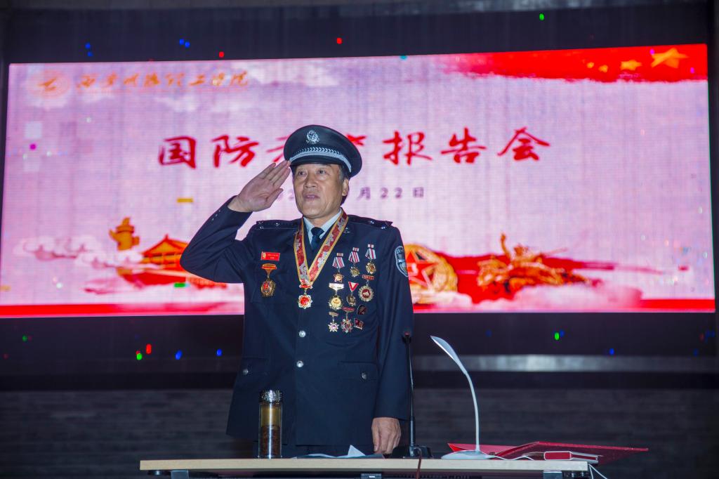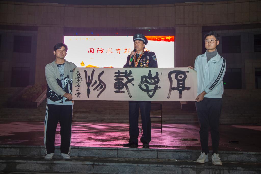 为增强新生国防观念,激发爱国热情,9月22日晚7时,学院军训团在中心广场举办了2020级新生国防教育报告会,特邀中华人民共和国成立70周年“纪念章”荣获者——马升云上校主讲。全体军政干部,参训新生聆听了报告。