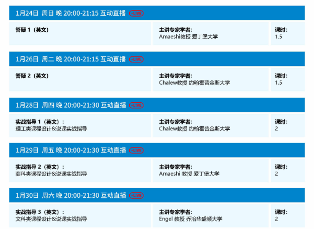 此次课程培训由理论背景讲解模块、教学技能培训模块、优质课程案例展示模块和课程设计及说课实战模块四个模块组成,全程英语教学。1月18日-22日教育部中外人文交流中心主任杜柯伟、原卫生部外事司司长宋允孚、美国康奈尔大学Parfait M Eloundou-Enyegue教授、英国牛津大学Liam Francis Gearon教授等10位主讲人分别围绕《探索联合国及其可持续发展》、《教师、学生和学校在实现可持续发展目标中的作用》、《国际组织所需的全球胜任力及其培养方案》等内容,通过主题讲座、专家互动答疑、案例分享等形式,向参训教师进行了高层次教师发展培训。在授课环节结束后(2021年1月24日-2021年1月30日)参加培训的28所高校3600余名教师分别加入理工类、商科类、文科类三个探讨组进行更深层次的在线学习和讨论。约翰霍普金斯大学Chalew教授、爱丁堡大学Amaeshi教授、乔治华盛顿大学Engel教授分别就一批高校老师们设计的商科类、理工类、文科类课程大纲和录制的教学演练视频进行了在线实战指导互动直播。