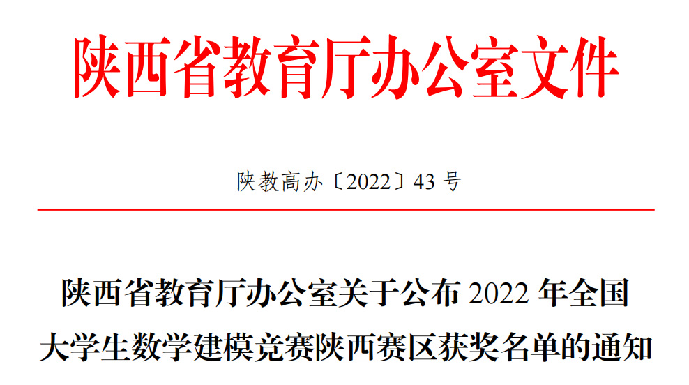 近日,2022年高教社杯全国大学生数学建模竞赛(CUMCM)成绩揭晓。经过激烈角逐,我校共获得本科组陕西赛区一等奖5项,二等奖18项;专科组荣获陕西赛区一等奖2项,二等奖2项,并蝉联陕西赛区优秀组织奖。