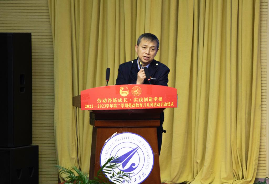 启动仪式结束后,“全国劳动模范”董宏涛老师作题为《踏上新征程,奋楫再出发》的报告。董宏涛老师通过讲述自己在平凡的岗位上不忘初心、精益求精、刻苦钻研的故事,勉励广大同学要以自信、自强、自律的标准要求自己,在平凡的岗位上做出不平凡的伟业。他讲到,劳动创造幸福,奋斗书写华章,劳动是通向伟大梦想的进步阶梯,是推动人类社会进步的根本力量。面对这样一个伟大的时代,我们要紧跟着党的前进步伐,以“逢山开路,遇水搭桥”的精气神,“明知山有虎,偏向虎山行”的英雄气,在劳动中体现价值。