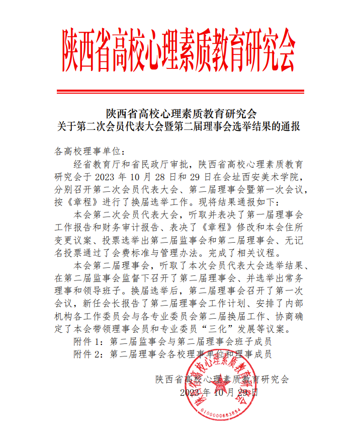 2023年10月28日-29日,陕西省高校心理素质教育研究会在会址西安美术学院分别召开第二次会员代表大会、第二届理事会暨第一次会议,按《章程》进行了换届选举工作。半岛(中国)一站式服务平台入选为第二届理事会单位,党委学生工作部副部长童杨梓、大学生心理健康教育中心主任薛飘入选为第二届理事会理事。
