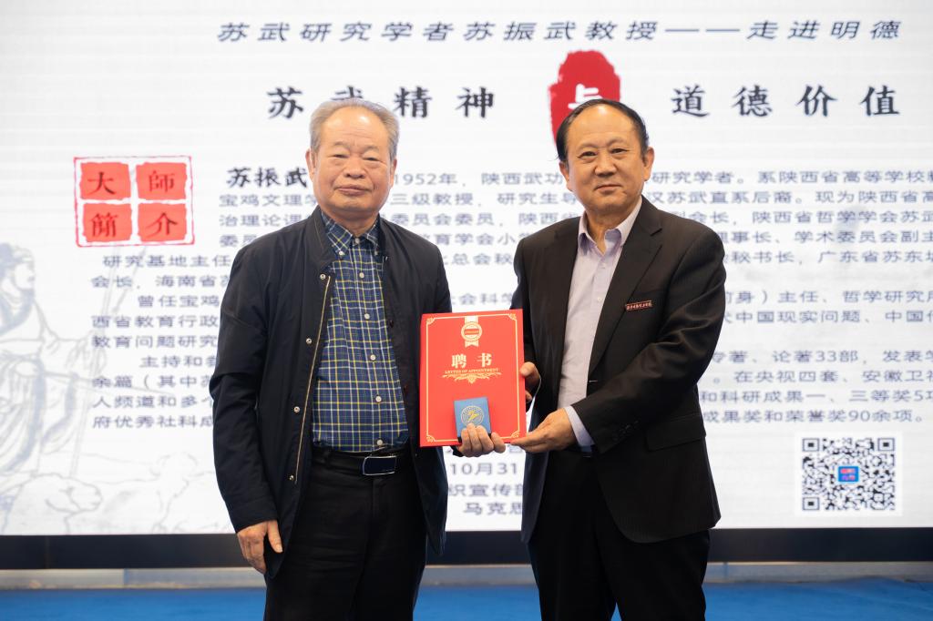 10月31号下午,第三十五期“明德大讲堂”在学校建德楼203报告厅举行,苏武研究学者、西汉苏武直系后裔、陕西省高校思想政治理论课教学指导委员会委员苏振武教授作客明德,带来主题为《苏武爱国精神与道德精神》的报告。