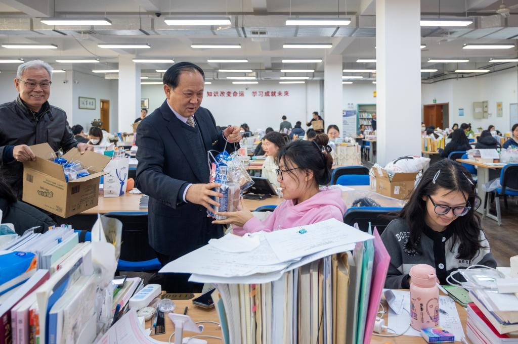 2024年全国硕士研究生初试在即,为鼓励考生积极迎考,增强备考信心,12月19日上午,校长王志刚,副校长朱延波,副校长刘星,学校办公室、党委组织宣传部、党委学生工作部负责人以及终南书院院长、副院长一行为紧张备考的学子发放考研能量包,为考研学子送去冬日的温暖和祝福。