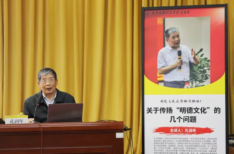 开班仪式后,我校马克思主义学院特聘教授、陕西省价值哲学学会副会长、陕西省伦理学研究会副会长孔润年教授作了题为“关于传扬‘明德文化’的几个问题”的专题讲座。孔教授以详实的史料记载为依据,理实结合、旁征博引、层层递进地阐述了自己对“明德”“明德文化”及“明德文化内涵”的理解与认识。