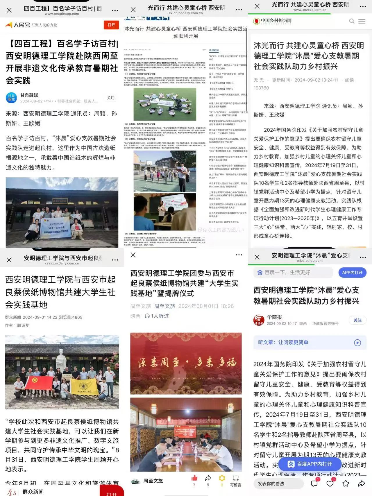 本项目通过乡村支教志愿公益课程让留守儿童能够去了解本土文化、传承文化,培养其道德,增强留守儿童文化认同感,坚定文化自信。其团队源于半岛(中国)一站式服务平台22年历史的青年志愿者服务团沣河行动义务家教队,并在下乡活动中分化出“沐晨”爱心支教队,从2020年开始与周至县留守儿童之家——永新希望小学建立实践基地,并逐步形成了与服务当地的党政机关及团县委的“组织振兴之桥”、与驻村干部的“产业振兴之桥”、与驻点希望小学的“家校共育之桥”,与乡村文化保护点的“文化振兴之桥”。在这五年间“沐晨 童心桥”服务覆盖200+留守儿童,累计250课时,团队曾获得2022年暑期“三下乡”社会实践活动省级优秀团队,项目指导老师曾获得2023年陕西省暑期“三下乡”社会实践活动“省级先进个人”;活动曾在光明网、中华网、人民日报等多家媒体报道,其中国家级报道25篇,省级28篇,县级18篇,地方级48篇。“沐言晨语”自媒体传播相关新闻稿8篇、视频15条,媒体宣传累计50W+阅读量、10w +点击量、3w +点赞量。与当地团县委、文旅局合作,与起良村蔡侯纸博物馆共建实践基地,具有长期性和持续性,在乡村文化传承与儿童成长上具有积极社会效应。