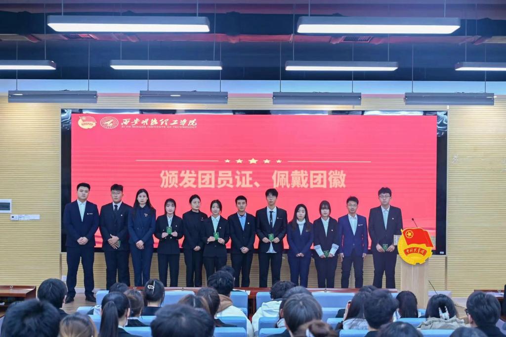 活动伊始,全体参会成员起立共唱《中华人民共和国国歌》;校团委副书记乔建老师宣读了2023年度新发展团员名单;各二级学院团委书记为新团员代表颁发团员证并佩戴团徽;校团委办公室梁智杰同学带领新团员庄严宣誓;入团介绍人代表兰天舒同学宣读了《中国共产主义青年团章程》中有关团员的权利和义务的相关内容;吕梦菲同学代表新团员发言,她对自己能光荣地加入中国共青团而感到无比自豪,她号召大家要永远铭记自己立下的誓言,以团员的标准严格要求自己并承诺在今后的学习生活中要不断提高自己、完善自己,不负韶华,勇于担当,力争成为德才兼备的优秀共青团员;校团委乔建老师进行了总结发言,他激励青年学生要传承革命精神、坚定理想信念、勤奋学习、练就本领。他讲到,广大团员要时刻牢记入团誓词,践行初心诺言,勇于进取创新,甘于艰苦奋斗,用执着的信念、只争朝夕的精神书写炫彩的青春华章。
