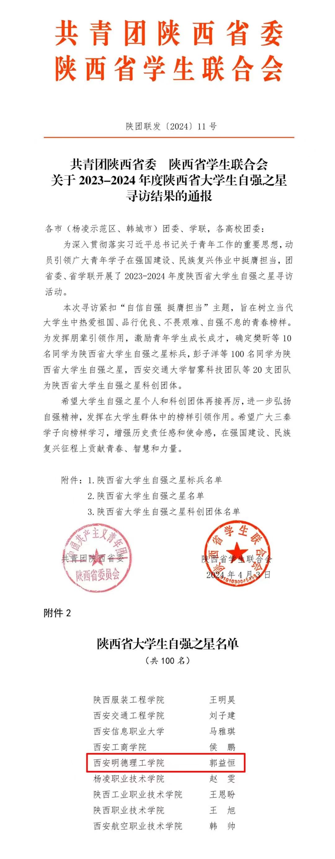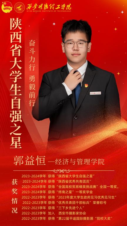 为深入贯彻落实习近平总书记关于青年工作的重要思想,动员引领广大团员青年为强国建设、民族复兴伟业挺膺担当,按照共青团中央、全国学联相关要求,开展2023-2024年度“中国大学生自强之星”寻访活动。经各学院推荐、校团委申报、省级推优。我校经济与管理学院郭益恒同学荣获“2023-2024年度“陕西省大学生自强之星”荣誉称号。