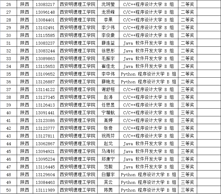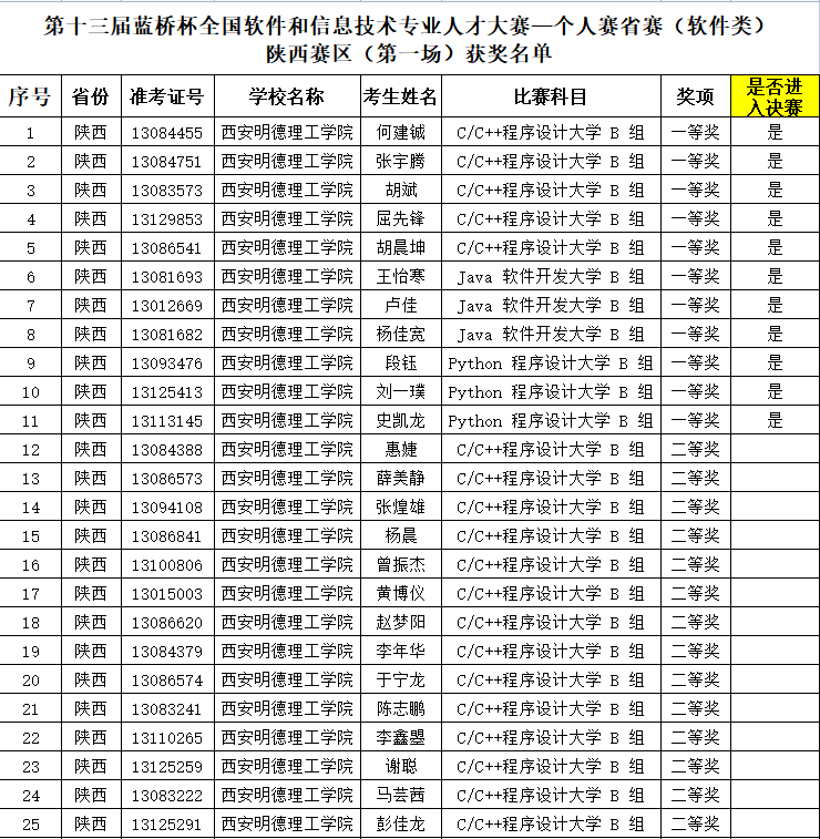 2022年4月28日,第十三届蓝桥杯大赛—个人赛省赛(软件类)陕西赛区(第一场)获奖名单揭晓,我校何建铖等11名同学获得一等奖,将参加第十三届蓝桥杯大赛全国总决赛。获奖总人数位列全省高校第五位。马芸茜等25名同学获得二等奖、吴云等14名同学获得三等奖。获奖数量位列全省高校前列。