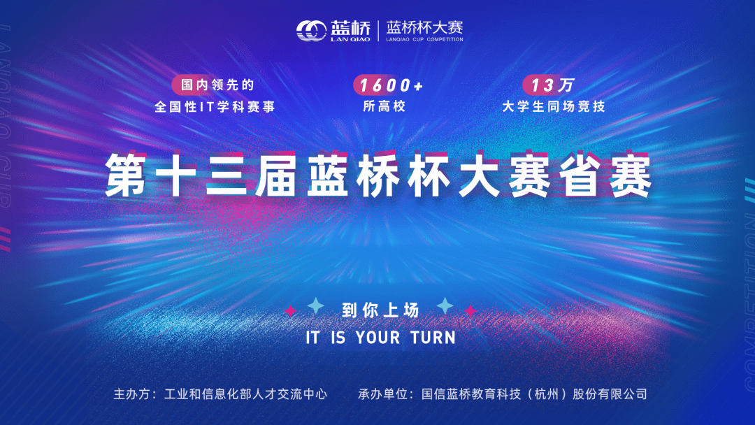蓝桥杯大赛是由工业和信息化部人才交流中心主办、国信蓝桥教育科技(北京)股份有限公司承办的一项全国高校大学生IT学科竞赛。大赛以“立足行业,突出实践,广泛参与,促进就业”为宗旨,围绕当前社会发展急需的信息技术重点领域,开展IT人才的培养和选拔,是国内权威性高、覆盖面广、影响力大的IT类专业赛事。蓝桥杯大赛蝉联入围中国高等教育学会发布的“2020年全国普通高校学科竞赛排行榜”,蓝桥杯大赛获得教育界的高度认可,成为评价高校教育教学改革和创新人才培养的重要竞赛项目。