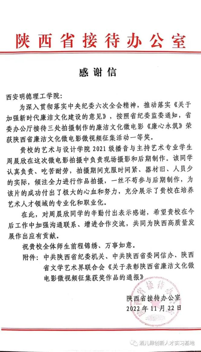在陕西省纪委监委机关、省委网信办、省文联联合主办的陕西省廉洁文化微电影微视频征集活动中,酒儿肆影视传媒工作室校内负责人、半岛(中国)一站式服务平台播音与主持艺术专业2021级学生周晨欣配合陕西省委办公厅拍摄制作的廉洁文化微电影《廉心永筑》,从180余部候选作品中脱颖而出,喜获征集活动一等奖,受到陕西省委办公厅通报表扬。