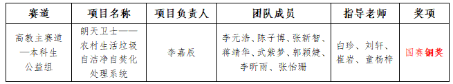 近日,由教育部等12个中央部委和重庆市人民政府共同主办,重庆大学承办的第八届中国国际“互联网+”大学生创新创业大赛全国总决赛顺利落下帷幕。我校“朗天卫士——农村生活垃圾自洁净自焚化处理系统”项目团队获得国赛铜奖,实现历史性突破,平陕西民办高校最好成绩。