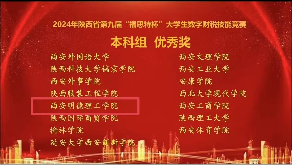 10月26日,2024年陕西省第九届“福思特杯”大学生数字财税技能竞赛落下帷幕,经济与管理学院学生荣获本科组比赛优秀奖。