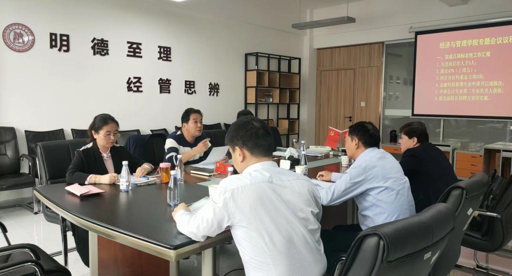 会议伊始,郭院长对校领导莅临学院指导工作表示欢迎,对校领导给予学院发展的关心和支持表示感谢,并向校领导说明召开本次专题工作会议的目的。紧接着,郭院长从高层次人才引进、学生就业、教改科研、新专业申报、师资队伍建设等方面汇报了开学以来经济与管理学院所开展的工作,重点就能源经济研究中心建设方案向与会校领导进行了汇报。刘敏副院长就学院联合培养开设冠名班事宜进行了汇报;何文举书记就开学以来毕业生就业工作,学院访企拓岗促就业专项行动开展情况,学院赴陕西省中小企业服务中心参访等事宜进行了汇报。