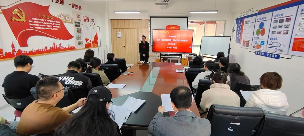 为深入学习贯彻习近平新时代中国特色社会主义思想,全面落实《普通高等学校辅导员队伍建设规定》要求,进一步加强学院辅导员队伍专业化、职业化建设,提高全体辅导员理论水平和育人能力,增强主题班会的教育性和实效性,经济与管理学院于12月8日上午在明志楼北606开展“学在明德”第一届辅导员主题班会评比活动,经济与管理学院党委书记何文举,学校党委学生工作部花芸,学院党委副书记冯纪潮出席活动并担任评委,学院全体辅导员参与活动,活动由辅导员卢宝全主持。