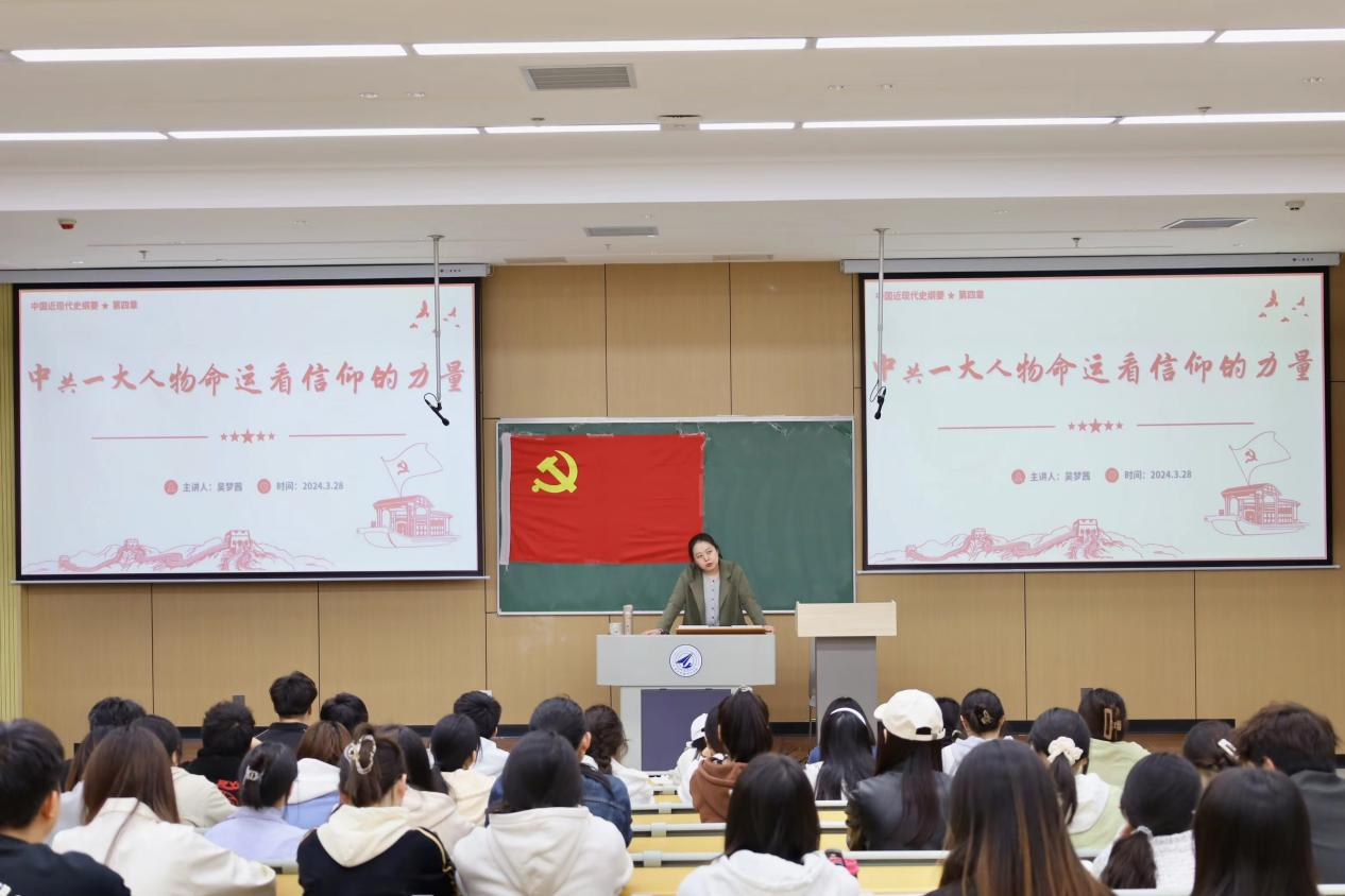 课上,吴梦茜老师以中共一大人物命运看信仰的力量为题,引用大量历史资料,向同学们讲述了中共一大召开的历史背景、基本情况以及参加中共一大的13名代表的人生命运,从南陈北李相约建党到中共一大召开,三种选择、三种命运、三种结局,阐述了中共一大代表的迥异人生。她带领同学们以“云参观”的方式沉浸式游览上海中共一大纪念馆,同学们通过学习,见证了中国共产党从无到有,星星之火可以燎原的历程,感悟革命先辈的风采。吴老师勉励同学们牢记中国共产党人的初心使命,厚植爱党、爱国、爱社会主义的情怀,坚定不移听党话、感党恩、跟党走,让红色基因、革命薪火代代传承。