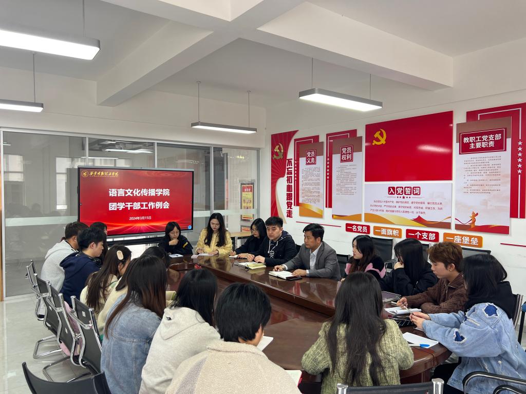 为加强团学组织规范建设,推进新学期团学工作有序开展。3月15日下午,语言文化传播学院在明志楼北406召开团学组织干部新学期工作例会。党委副书记杨峰,团委书记张兴以及辅导员周清岚加了此次会议,会议由张兴主持。