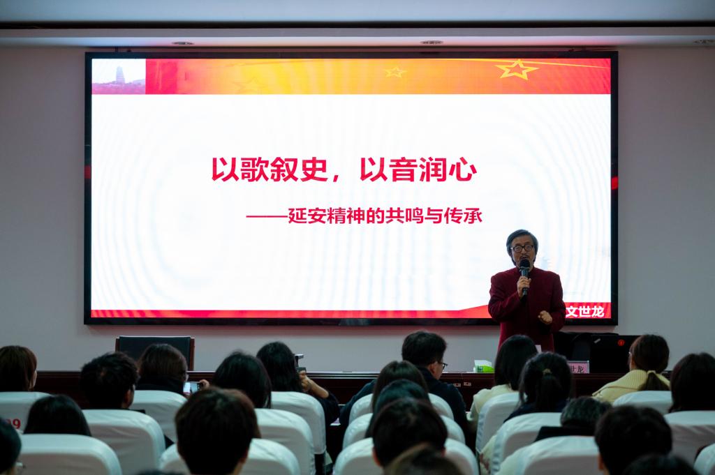 22日晚,同学们在甘泉县党校听取题为《以歌叙述史,以音润鑫心--延安精神的共鸣与传承》的音乐党课。文世龙教授通过讲解陕北民歌《信天游》《黄河大合唱》等歌曲的创作背景、历史文化、唱法技巧带同学们感悟那个我党艰苦奋斗的年代,随后文教授通过自身专业相结合,用英语翻译着陕北民歌,抒情地演唱着陕北民歌,用外国人听得懂的方式,将陕北民歌唱响世界,用自己独特的方式来弘扬爱国精神,联结宗族根脉、传递家国情怀。