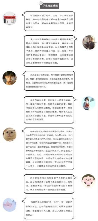 最后,此次观展也促使同学们对自己的毕设方向和个人不足之处进行反思。通过观摩他人的作品,他们可以更清晰地认识自己的兴趣和发展方向,同时也能够意识到自己的不足之处,从而有针对性地加以改进和提升,这对于他们未来的学习和发展都至关重要。