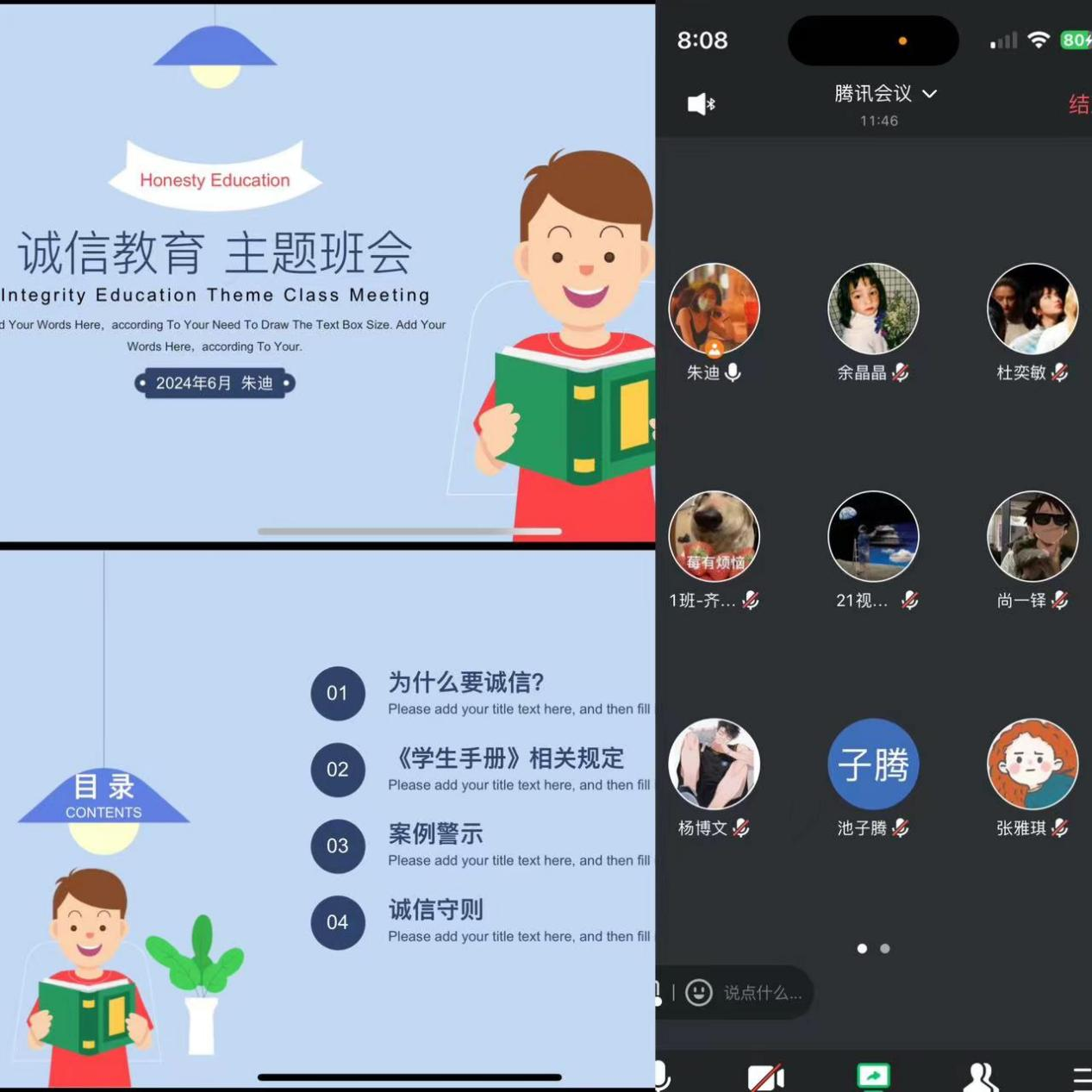 为进一步加强学生的诚信意识,弘扬诚信精神,营造诚信的校园文化氛围,6月10日,辅导员韩璐在汉源楼405教室开展诚信教育的主题班会。会上,辅导员以诚信的内涵和价值为切入点,向同学们深入阐述了诚信的重要性和意义,此外,还介绍了当前社会上存在的各种不诚信现象,以及这些现象对个人和社会的危害,提醒大家要警惕这些不诚信行为并坚决抵制,从小事做起,从自身做起。