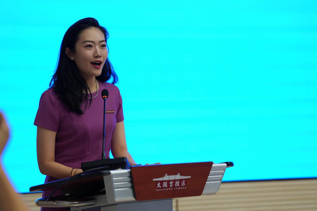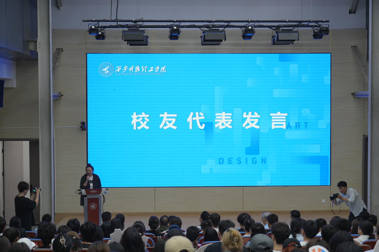 优秀校友代表、郭莘空间设计(西安)有限公司创始人郭莘发言。在明德这方土地上,学子们朝气蓬勃、迅速蜕变,老师们默默无闻、悉心指导,教学相长,学子与母校一同成长。2024届学弟学妹已如期完成学业,带着艺术的智慧、设计的理想,即将踏上新征程,开启人生新篇章。希望学弟学妹们在以后的工作道路上,牢记明德校训,怀揣赤诚之心,坚持艺术创作,以优异成绩和实际行动为母校的发展贡献力量!