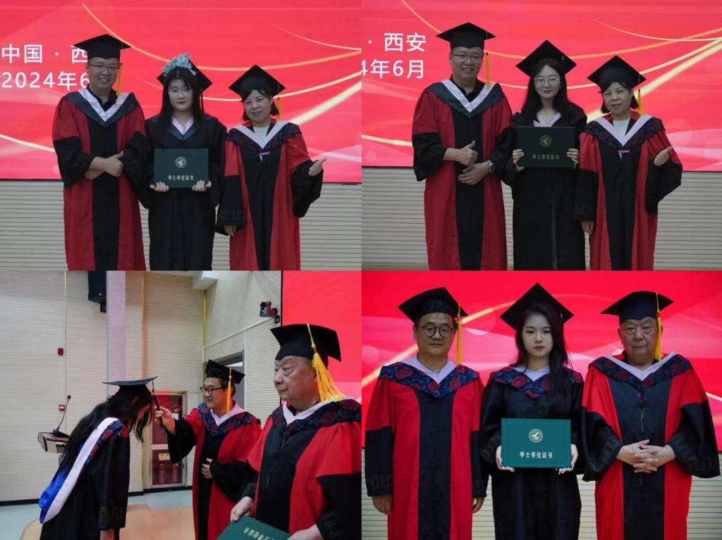 学位授予仪式开始。学院院长苟秉宸教授,副院长冯强老师,学院特聘教师、大师工作室柏雨果教授,学校学位评定委员会委员舒粉利老师为毕业生拨穗正冠并颁发学位证书。同学们依次上台并合影留念。