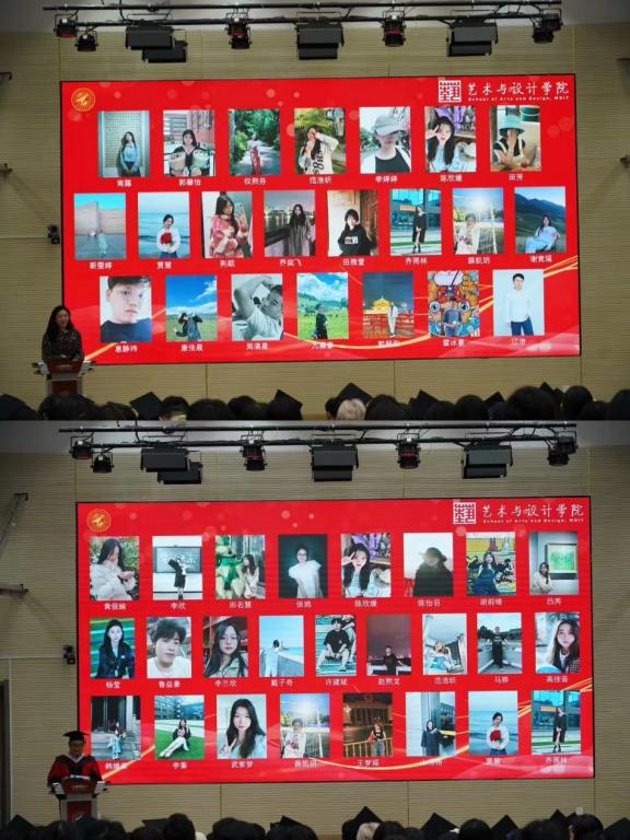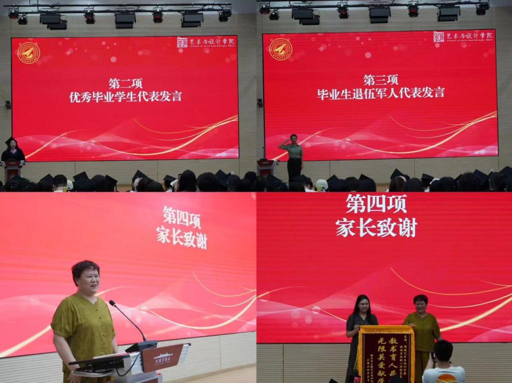 毕业生代表南露同学发言,她回顾四年校园时光,深情告白母校、学院与老师。她讲到母校如同母亲一般,给予了明德每位学子无私的爱与奉献,感谢大学四年学校的培养,学院的帮助,老师的教诲与鼓励,同时感谢大学四年同学的陪伴。她表示将带着所学所思所想,走向更⼴阔的天地,去追寻自己的梦想,无论未来面临怎样的挑战,都会保持对艺术的热爱和追求,并相信自己⼀定能够创造出属于自己的人生精彩。