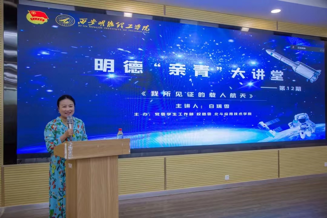 6月9日,明德“亲青大讲堂”12期在学校建德楼202报告厅举行。爱太空科技董事长,原新华社著名航天、军事记者,白瑞雪带来主题为“我所见证的载人航天”报告会。学校党委副书记董昊、党委学生工作部、校团委、北斗应用技术学院、智能制造与控制技术学院相关负责人及来自我校和西北工业大学、西安邮电大学等5所高校的航空航天爱好者近千人在线上聆听了报告会,报告会由童杨梓主持。