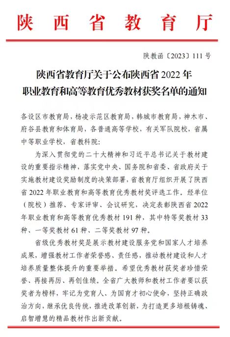 根据《陕西省教育厅关于开展2022年职业教育和高等教育优秀教材奖评选工作的通知》,我校教师张健主编的《计算机网络实训教程》获陕西省优秀本科教材二等奖。