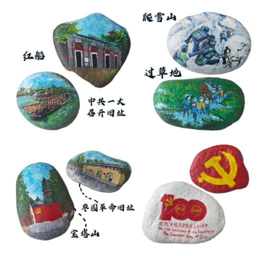 本次活动经过前期精心准备,艺术与设计学院党总支结合学科专业优势,将中国共产党发展历程中的重要事件和革命精神用石头画形式表现出来。每幅作品主题凸显,色调鲜明,元素规范,有的是中国共产党成立100周年庆祝活动标识;有的是中共一大召开旧址,标志着中国共产党的正式成立;有地体现了“开天辟地、敢为人先的首创精神,坚定理想、百折不挠的奋斗精神,立党为公、忠诚为民的奉献精神”科学内涵的红船精神;有地彰显了坚定革命理想信念,不怕艰难险阻,患难与共、艰苦奋斗的长征精神;有地展现了“坚定正确的政治方向,解放思想实事求是的思想路线,全心全意为人民服务的根本宗旨,自力更生艰苦奋斗的创业精神”科学内涵的延安精神。